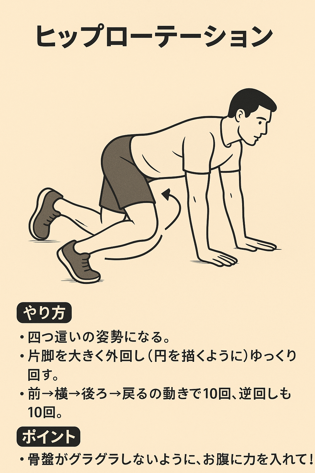 3. 前→横→後ろ→戻るの動きで10回、逆回しも10回。
